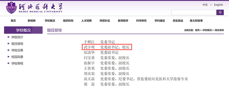 近日,河北医科大学官网“现任领导”一栏更新显示,武宇明已任河北医科大学党委副书记、校长。