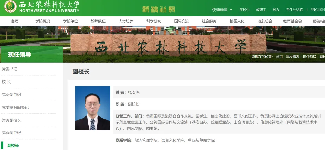 近日,西北农林科技大学官网现任领导栏更新显示,张宏鸣已任西北农林科技大学副校长。