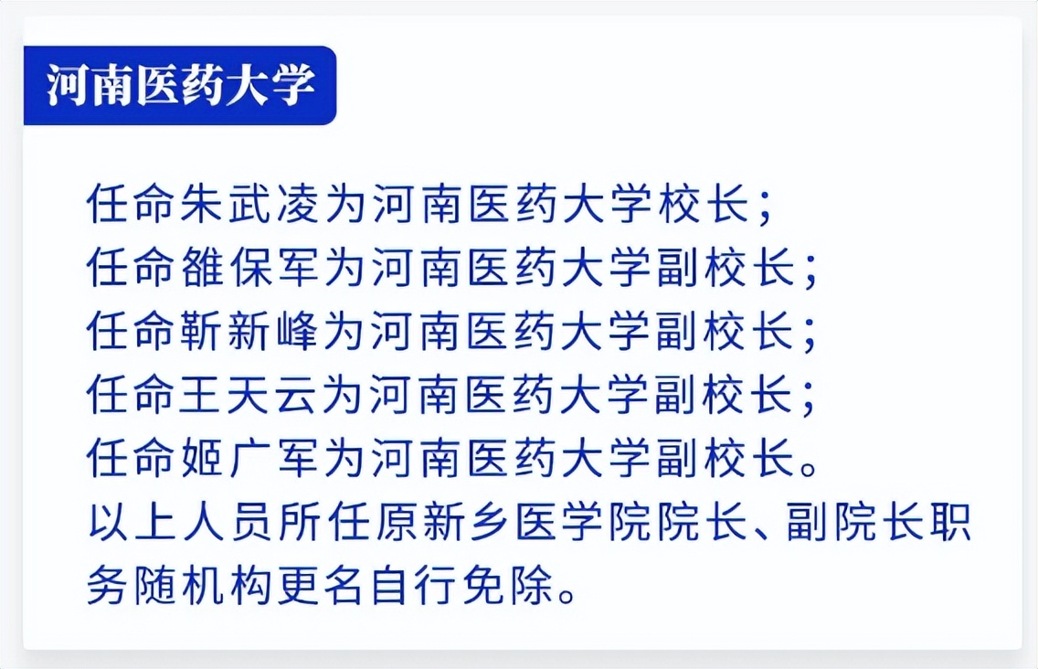 以上人员所任原新乡医学院院长、副院长职务随机构更名自行免除。