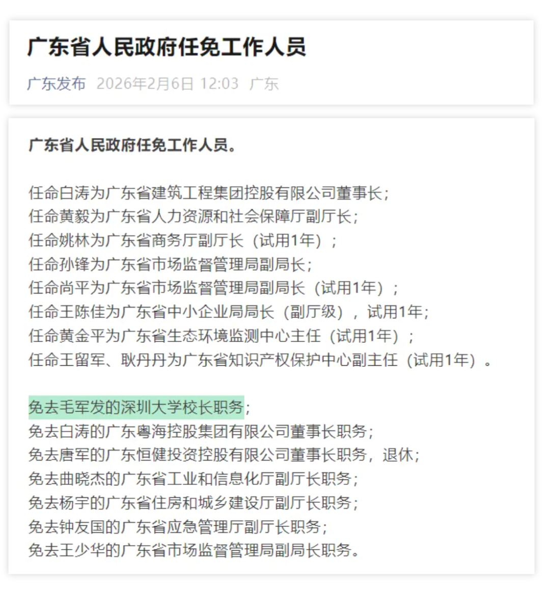 近日,广东省人民政府任免工作人员,免去毛军发的深圳大学校长职务。