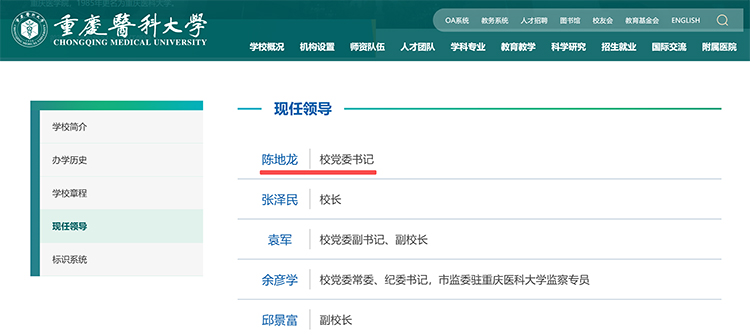 近日,重庆医科大学官网“现任领导”一栏更新显示,陈地龙已任该校党委书记。