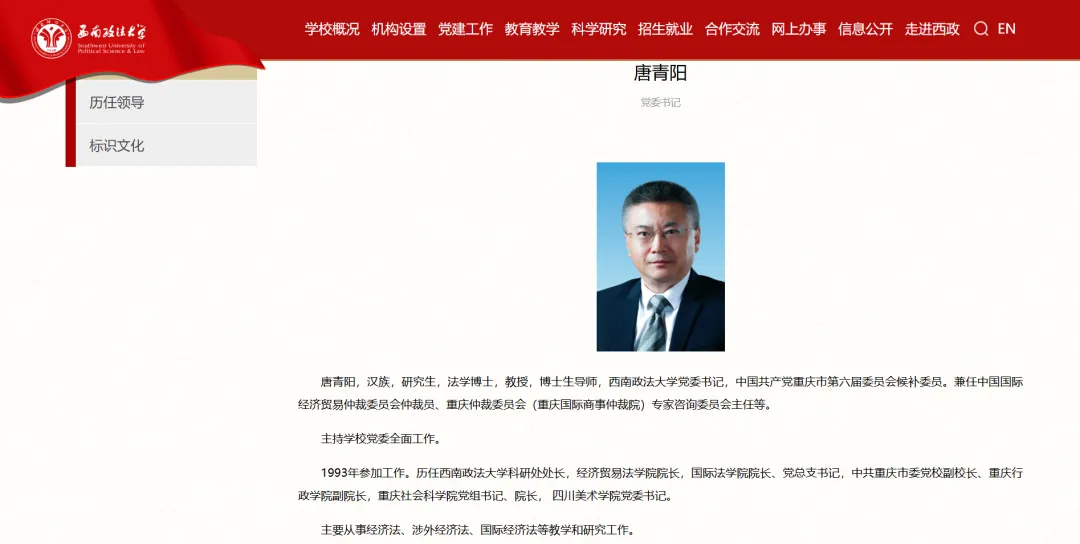 据西南政法大学官网“现任领导”一栏显示,唐青阳已任该校党委书记。
