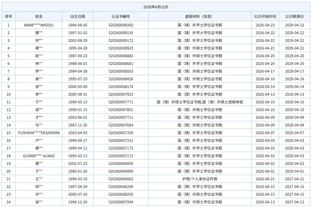 根据公示内容,2026年1-4月,共有99位申请人在国(境)外学历学位认证过程中,有向中心提交虚假材料(信息)行为,提交的认证申请材料包含虚假、伪造或无效的信息资料。