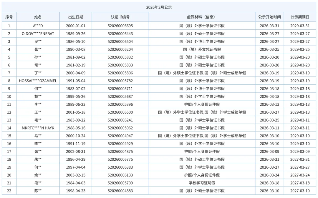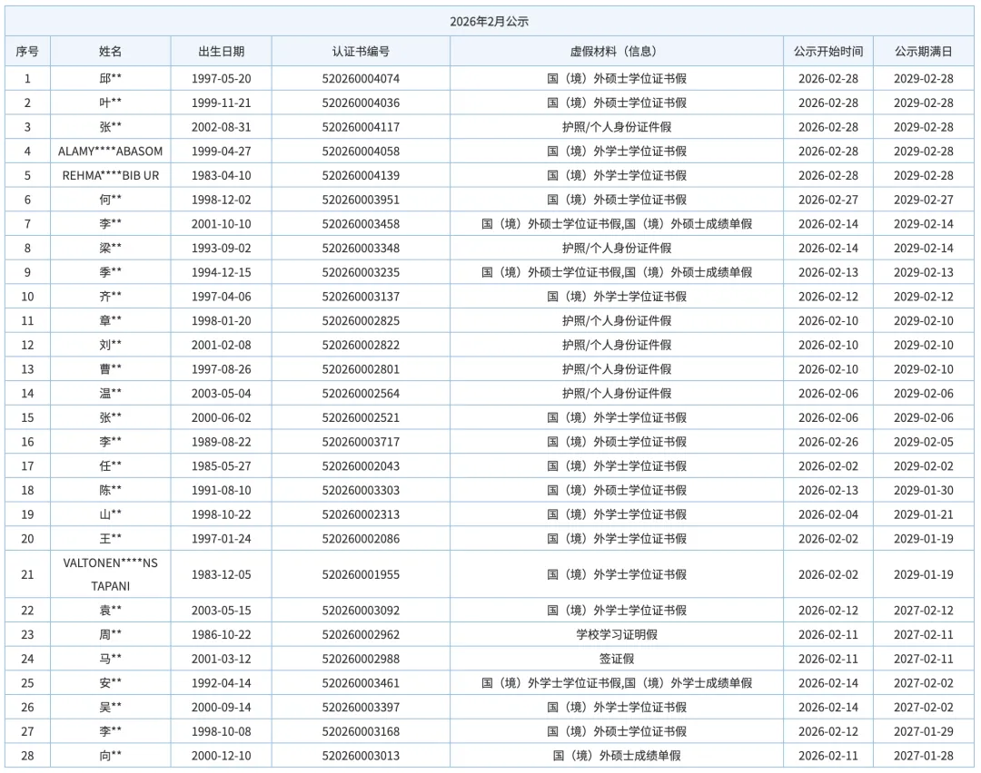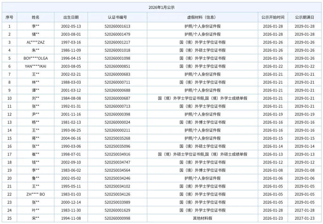 近日,教育部留学服务中心发布《2026年国(境)外学历学位认证提供虚假材料(信息)行为公示》。
