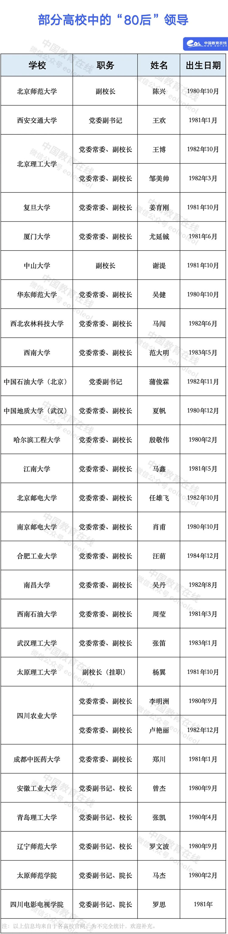今年以来,有多位“80后”担任高校校长或副校长职务。
