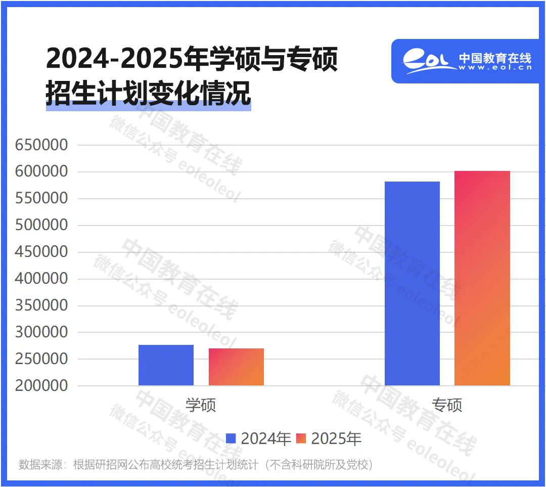另一方面,专业学位硕士招生比例显著提升。中国教育在线发布的《2025全国研究生招生调查报告》显示,在2025年的统考招生计划中,专硕招生计划占比为68.99%,超过总招生计划人数的2/3,相比2024年的67.8%,提高了1.19个百分点。从专硕与学硕统考招生计划增幅看,2025年专硕招生计划人数较上年增长3.3%。与之相反,学硕的招生计划人数则下降2.22%。