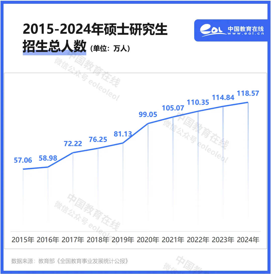 根据教育部公布的数据,2015年至2024年(2025年官方数据未出)这十年间,硕士研究生的招生人数一直在稳步上升。2023年全国硕士研究生招生达114.84万人,同比增长4.07%。2024年,招生人数增加到了118.57万人,相比于2023年,扩招增幅达3.24%。