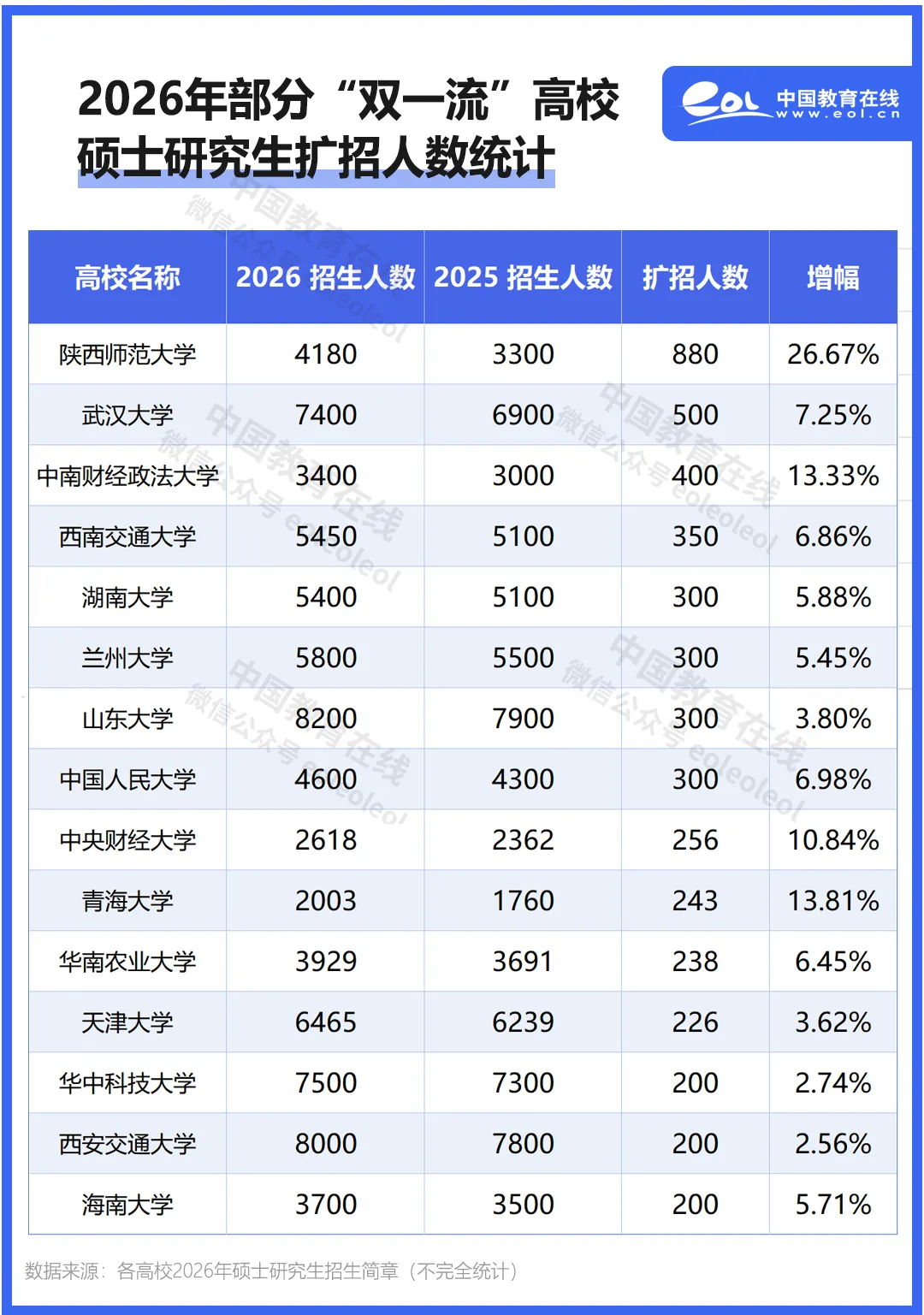 据不完全统计,2026年,超过50所“双一流”高校都扩大了硕士招生规模。其中近40所高校扩招人数大于100人。陕西师范大学扩招人数最多,达到880人,增幅达26.67%。武汉大学和中南财经政法大学紧随其后,扩招人数分别为500人和400人。此外西南交通大学、山东大学、兰州大学、湖南大学、中国人民大学这5所高校扩招人数均超过300人。