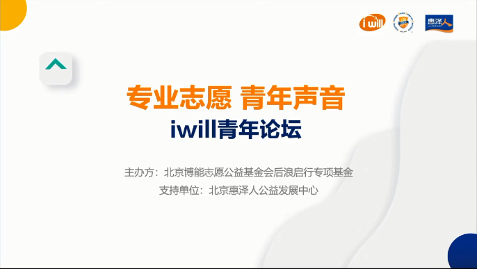 2022年12月5日博能基金会后浪启行专项基金主办、北京惠泽人公益发展中心支持举办的“专业志愿 青年声音” i Will青年论坛活动于线上成功召开。在通过长达一年的征选周期评选出了6组来自全国各地的优秀青年志愿者代表并邀请他们来分享和展示青少年是如何运用自身所学到达的专业进行志愿服务。青年志愿者代表生动的讲述了自己从事专业志愿服务的经历,也让我们看到了青年志愿者身上的力量和热忱。