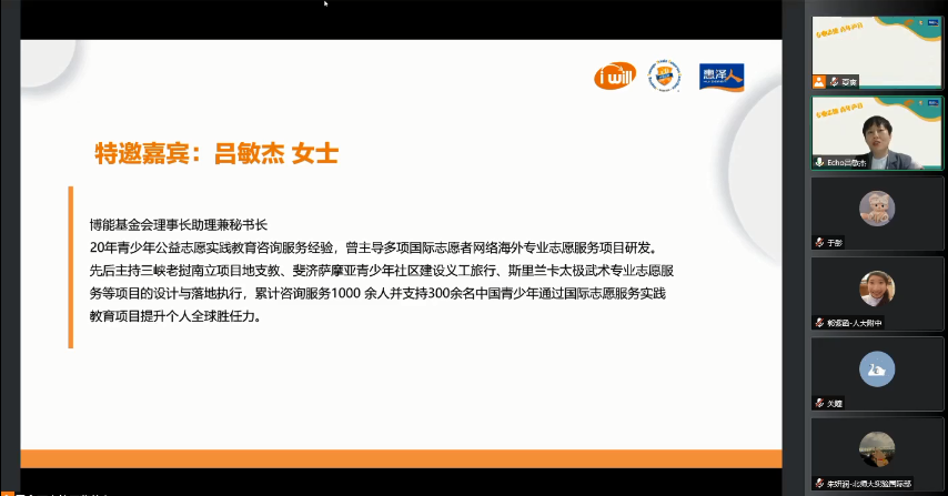 感谢大家能够在国际志愿者日这一天一起来分享志愿服务经历、弘扬志愿服务精神。博能基金会创立的六年多来取,得了非常显著的社会成效,专业至善自始至终贯穿在博能从设立到运行再到发展。从概念上来说,把专业志愿服务定义为“运用专业技能提供的符合职业或行业标准和规程的志愿服务”,更加强调了标准化和规范化,专业志愿服务不仅是志愿服务的类别之一,而是上升到了一种影响力价值投资的维度,专业志愿者也是受益人之一。而国际志愿服务International Voluntary Service代表促进和平与增进理解,兼容并蓄,团结协作,积极参与和知识分享的非正式教育工具(CCIVS),是非学校教育的一种教育形式。有数据表明,青少年参与志愿服务的心理疾病概率会降低,就业率会提升80%.在当下和不久的将来同学们参加志愿服务一定会有更多意想不到的收获,也希望的大家在今后的志愿服务中一定要发散思维,学习用专业志愿的方式来投资我们共同的未来,为联合国的可持续发展目标贡献自己的力量,影响更多身边的小伙伴,团结起来,马上行动!