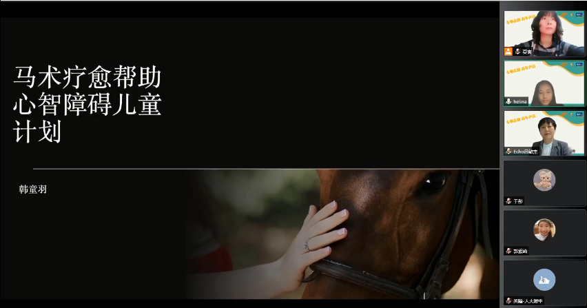我是学生,也是一名国家青少年马术队的队员。马术疗法作为一种可以帮助治疗孤独症儿童的动物辅助治疗,正在被越来越多的孤独症康复机构所尝试。作为动物辅助治疗中的一种,马辅助疗法有许多好处,但大众对于马术疗法的认知不足、没有条件实行、特教老师匮乏、治疗成本高昂都限制了马术治疗的发展。对于马术辅助治疗的普及,我正在学心理学的相关课程;在马术俱乐部参加马术治疗的实践项目,并创建了马术公众号,以推文、图片和视频的方式让大家直观地了解马术治疗;在学校,我通过成立马术club,定期邀请专业人士来讲课等形式在学校内部开展普及马术、马术治疗的活动;最后我也会作为发起人在全国范围内定期发起多城市的连麦活动,带领更多的人一起来关注、探讨、推广马术治疗,提升大众对于马术治疗的认知和理解,号召社会对于特需群体的尊重、权利保障、和经济、精神方面的支持。我希望在未来有机会向公众推广马术辅助治疗这项计划,帮助身边更多有需要的人接受不一样的治疗,早日走出疾病的阴影。以马为伴,从爱出发。请我们用爱来推广马术疗愈,让更多人从中受益吧!