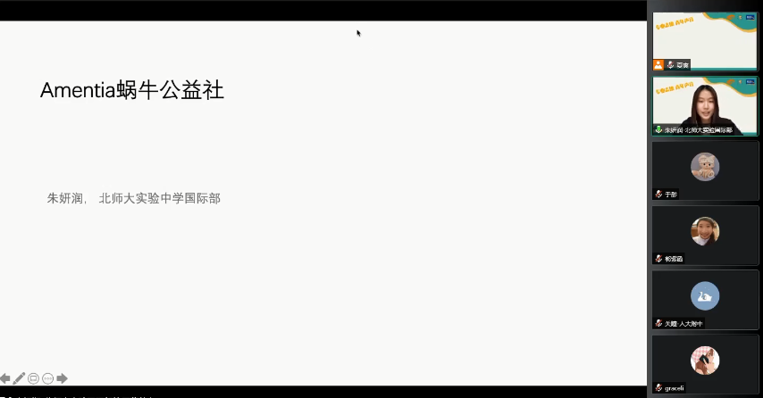 我主要的志愿服务人群是心智障碍者。为了让更多的中学生了解这个群体,我在学校创建了Amentia公益社,旨在让公益服务深入校园,让更多的同学参与公益、热爱公益,为需要帮助的人群伸出援助之手。Amentia公益社截止目前共招募校内外中学生志愿者达100余人,通过创建公众号,面向学校和社会进行文章宣传,并在学校举办讲座的方式,逐渐有更多的同学愿意放下成见,进一步了解这个群体真正的样子。在疫情期间举办线上陪伴活动中,每两名同学对接一个心智障碍者,与障碍者家长和障碍者本人进行为期两天,次数自定的视频聊天。之后的举办“艺术之夜”活动中志愿者和心智障碍者一起学习歌曲,绘画,并展示各自的成果。在今年暑假“魅力夏日。 融合游天坛”活动中,来自北京四所高中的志愿者一对一对接新伙伴。我清楚地看到大家如何从一开始的不熟悉到互相交流时没有束缚感,再到无话不谈。 融合活动给心智障碍者生活照进了一束光,他们从活动中接触到不同的人和事,对世界有了不同的认知和更深的感触。我希望未来的活动也能也将把这份感触带给他人,让它继续传递下去。