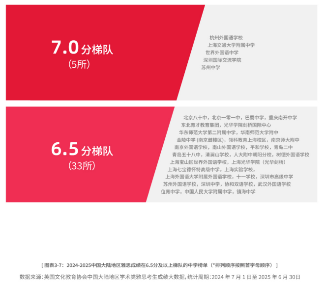 共有38所“英国文化教育协会雅思示范中学”进入6.5分及以上梯队,其中杭州外国语学校、上海交通大学附属中学、世界外国语中学、深圳国际交流学院、苏州中学等5所中学成功迈入7.0分梯队,折射出国内中学教育在国际化人才早期培养领域的积极探索与成效。
