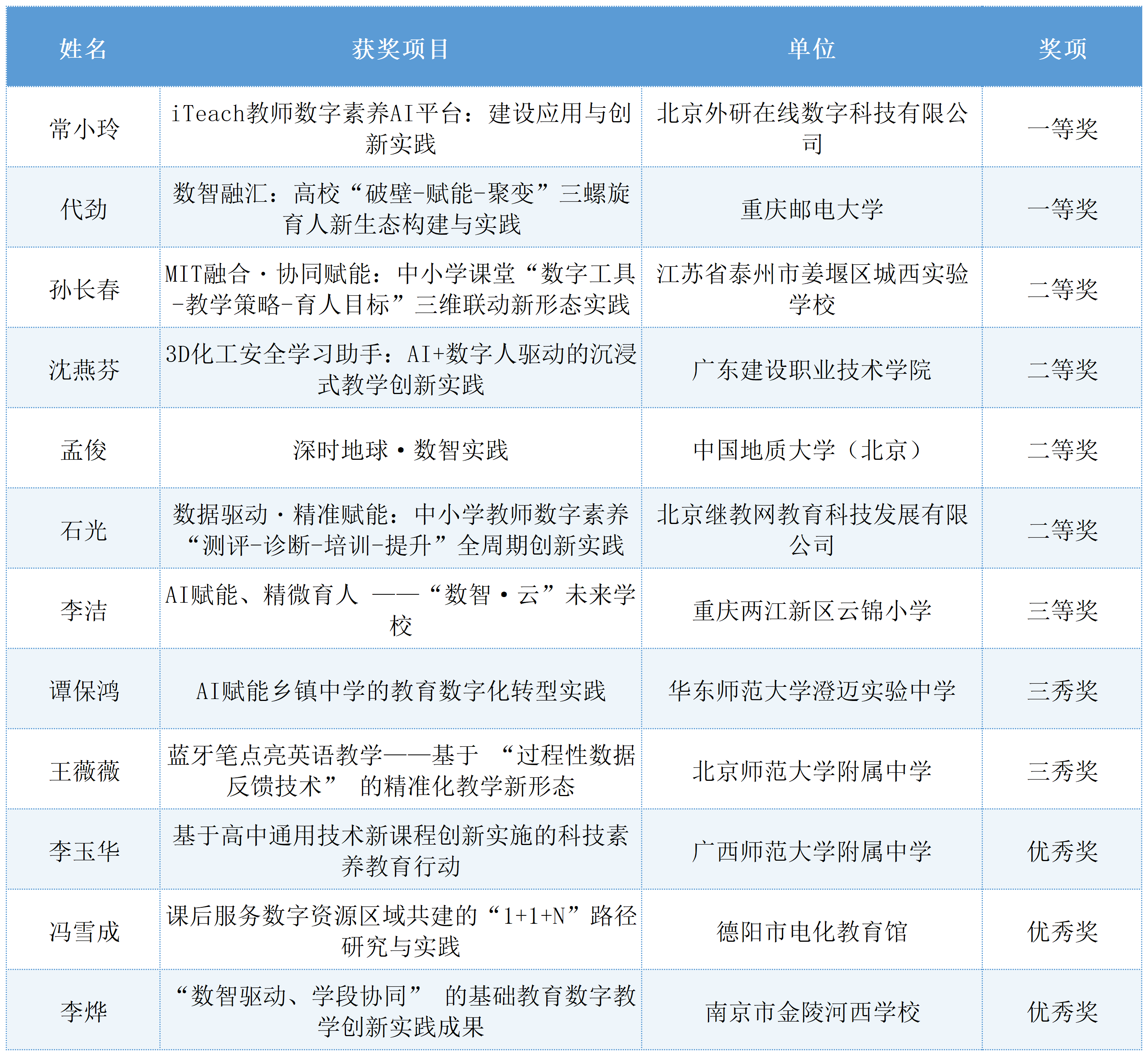 值得一提的是,在同期举办的第八届中国教育技术创新发展与应用成果大会上,教师数字素养发展专业委员会荣获“卓越影响力奖”,其12家会员单位也获颁“数字教育创新成果奖”。这些荣誉,既是对专委会在数字教育领域实践成果的认可,也激励着其在未来继续发挥示范引领作用,为推动我国教师数字素养发展作出更大贡献。