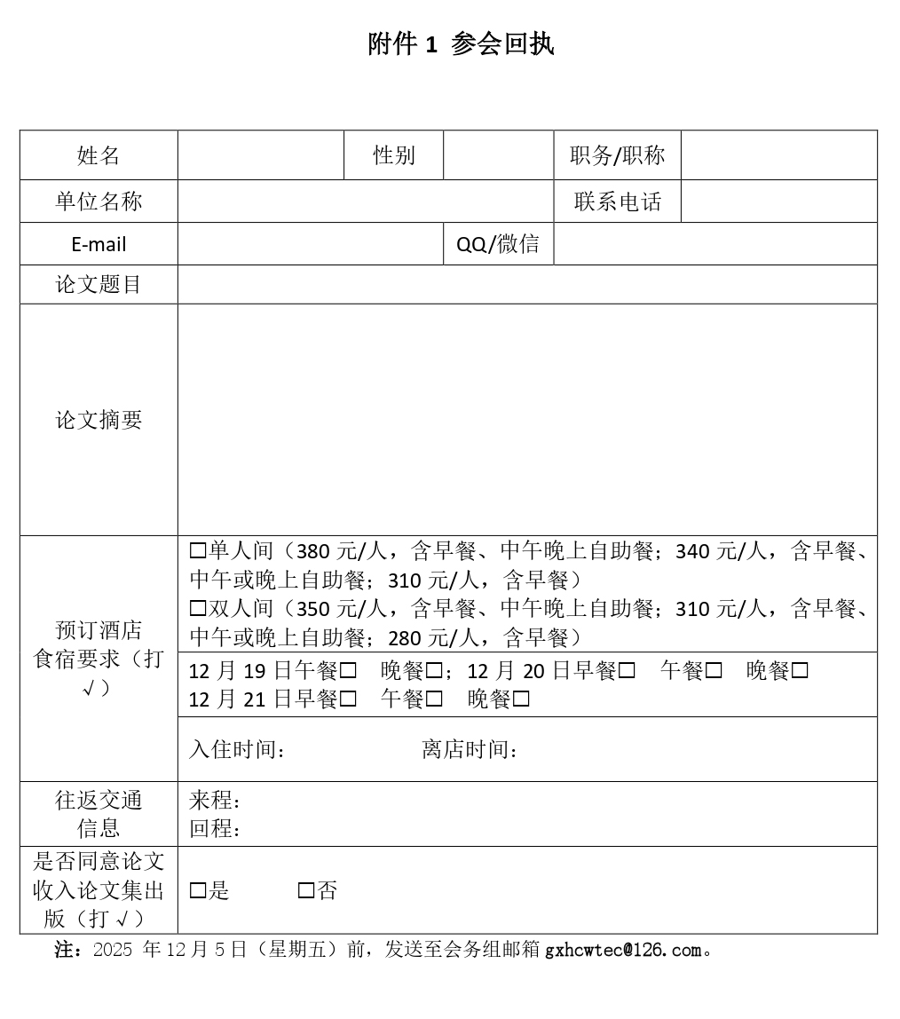 请与会代表在2025 年12月5日(星期五)前,将参会回执(见附件1)发送至会务组邮箱gxhcwtec@126.com,以便统计和筹备后续会务。