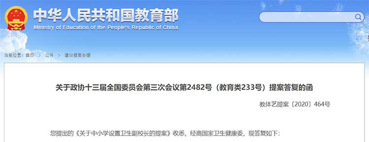 近日,教育部网站发布对《关于中小学设置卫生副校长的提案》的答复。答复中指出,自新冠肺炎疫情发生以来,联防联控机制显得尤为重要,特别是中小学校的卫生健康管理也受到各方的关注。“卫生健康副校长”进校园是学校疫情防控的迫切需要。