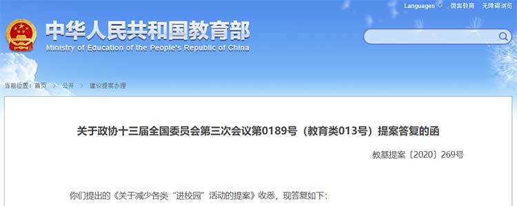 答复中提到,下一步,教育部将会同相关部门,认真贯彻落实相关规定,完善各类“进校园”活动审批和监管制度,推动各地出台更有针对性和实效性的举措,继续加强对各类“进校园”活动的规范管理和统筹安排,扎实推进规范进校园工作取得实效,为中小学校营造良好育人环境。