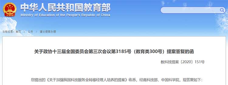 近日,教育部对“关于加强我国科技服务业转移经理人培养的提案”进行答复。答复表示,教育部支持高校开展技术转移学历教育。