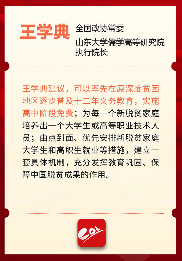 贫困家庭学生毕业后就业也颇受王学典关注,他建议在国家层面制定安排新脱贫家庭大学生的就业政策、措施和办法,切实为贫困学子就业提供机遇和平台,确保新脱贫家庭全日制大专以上学生有计划就业,进一步巩固和保障脱贫成果。
