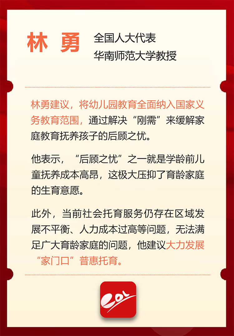 “我国现在义务教育阶段是从小学到初中,我建议,把幼儿园教育纳入全民义务教育,减轻育龄妇女的家庭负担。国家的钱有限,不如从儿童教育做起,这是我们国家与民族的基础。”林勇说。