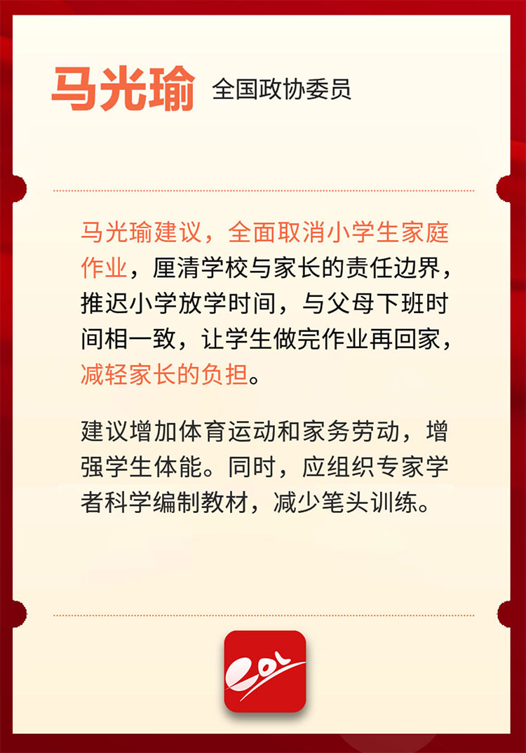 对此,马光瑜建议,全面取消小学生家庭作业,厘清学校与家长的责任边界,推迟小学放学时间,与父母下班时间相一致,让学生做完作业再回家,减轻家长的负担。同时增加体育运动和家务劳动,增强学生体能。此外,应组织专家学者科学编制教材,减少笔头训练。