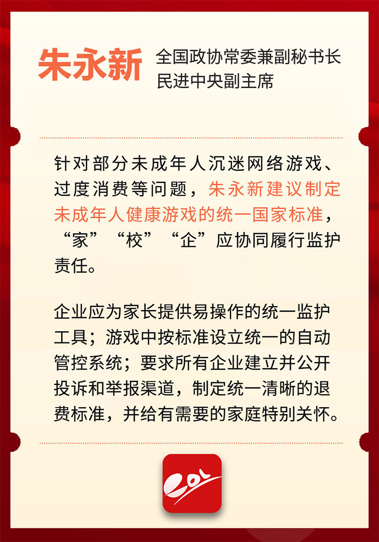 朱永新建议制定未成年人健康游戏的统一国家标准,“家”“校”“企”应协同履行监护责任: