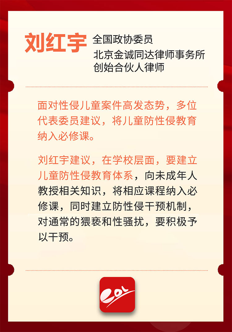 全国政协委员、北京金诚同达律师事务所创始合伙人律师刘红宇建议,“比如,在国家层面要关注技术变革带来的危害,比如利用互联网诱使未成年人裸聊、传播儿童色情视频;加大对性侵前科人员数据库的建设。在学校层面,要建立儿童防性侵教育体系,向未成年人教授相关知识,将相应课程纳入必修课,同时建立防性侵干预机制,对通常的猥亵和性骚扰,要积极予以干预。”