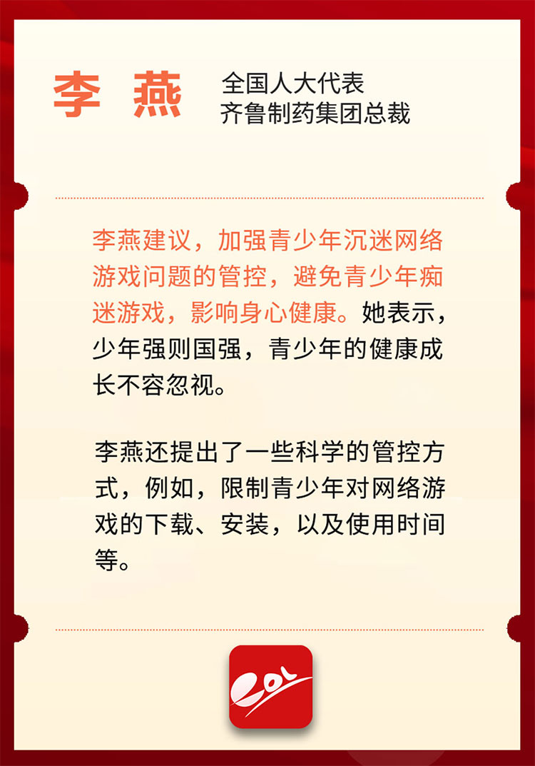 全国人大代表、齐鲁制药集团总裁李燕在接受采访时说,她将在今年的全国两会上建议加强青少年沉迷网络游戏问题的管控,避免青少年痴迷游戏,影响身心健康。李燕表示,少年强则国强,青少年的健康成长是不容忽视的。她还提出了一些科学的管控方式,例如,限制青少年对网络游戏的下载、安装,以及使用时间等。