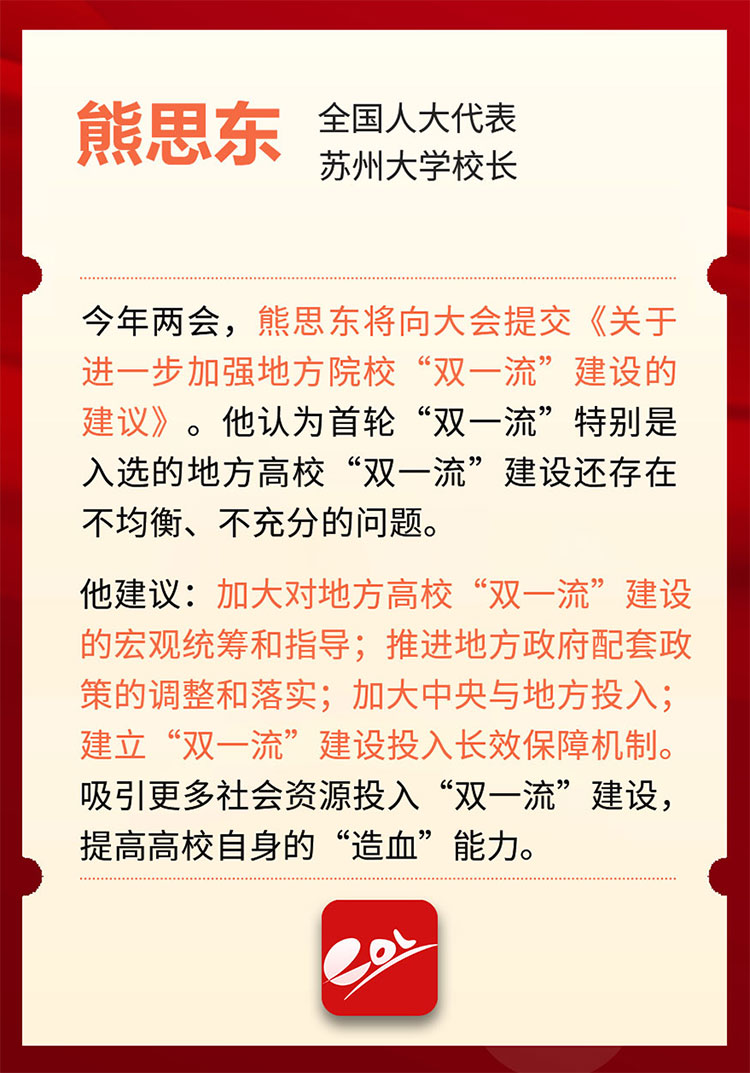 熊思东建议: 一是加大对地方高校“双一流”建设的宏观统筹和指导。地方政府应在办学经费、特色学科建设、人才队伍、学位授权资格及招生计划等方面持续加大支持力度,引导地方政府推进“双一流”建设高校分层分类发展。