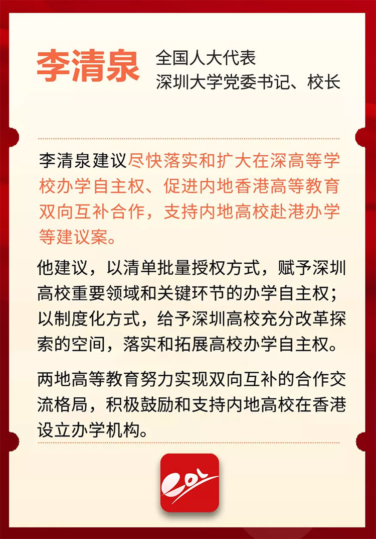 李清泉建议,以清单批量授权方式,赋予深圳高校重要领域和关键环节的办学自主权,如赋予博士硕士学位授权自主审核权、推动研究生招生计划与招生录取方式改革试点、支持扩大本科推免生比例、优化高等教育国际合作项目的审批程序等;建议以制度化方式,给予深圳高校充分改革探索的空间。