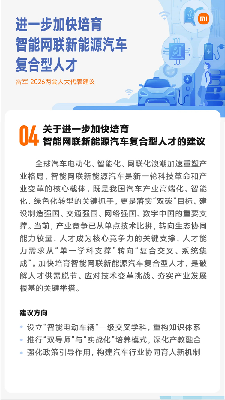 据小米公司公众号消息,雷军在2026全国两会中提出5条建议。其中一条:建议进一步加快培育智能网联新能源汽车复合型人才。雷军建议设立“智能电动车辆”一级交叉学科,重构知识体系;推行“双导师”与“实战化”培养模式,深化产教融合;强化政策引导作用,构建汽车行业协同育人新机制。