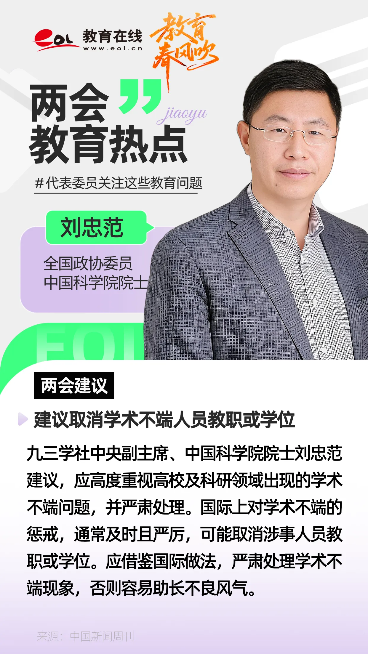 全国政协委员、九三学社中央副主席、中国科学院院士刘忠范表示,应高度重视高校及科研领域出现的学术不端问题,并严肃处理。国际上对学术不端的惩戒,通常及时且严厉,可能取消涉事人员教职或学位。应借鉴国际做法,严肃处理学术不端现象,否则容易助长不良风气。