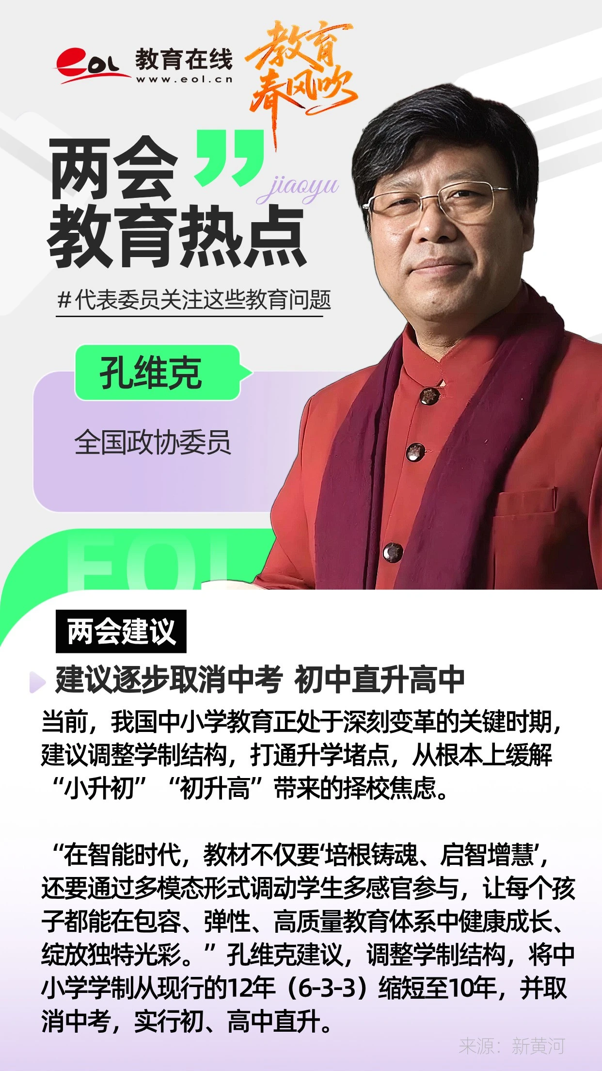 “在现有的学制下,为了小升初、初升高,很多初中,甚至高中的知识都压到了小学阶段,小学生理解不了,还极大增加了心理压力。”孔维克建议,调整学制结构,将中小学学制从现行的12年(6-3-3)缩短至10年,并取消中考,实行初、高中直升。