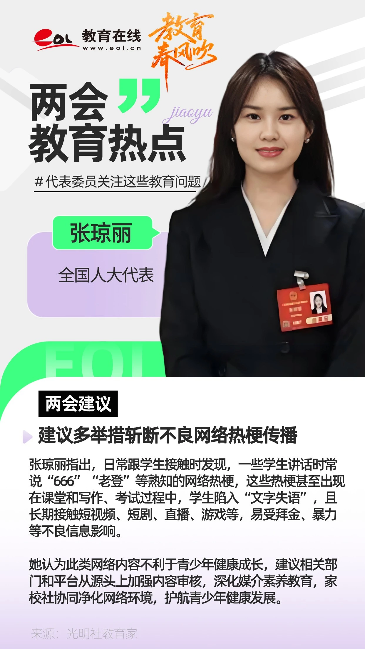 张琼丽表示,一些学生讲话时常说"666""老登"等熟知的网络热梗,这些热梗甚至出现在课堂和写作、考试过程中,学生陷入"文字失语"。她建议相关部门和平台从源头上加强内容审核,深化媒介素养教育,家校社协同净化网络环境,护航青少年健康发展。