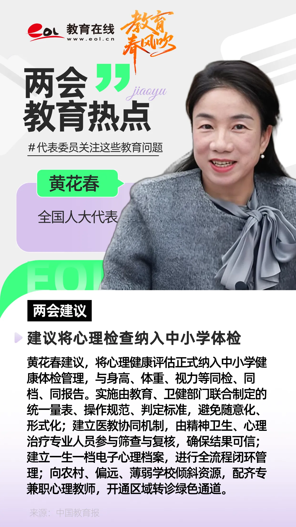 黄花春:建议将心理检查纳入中小学体检