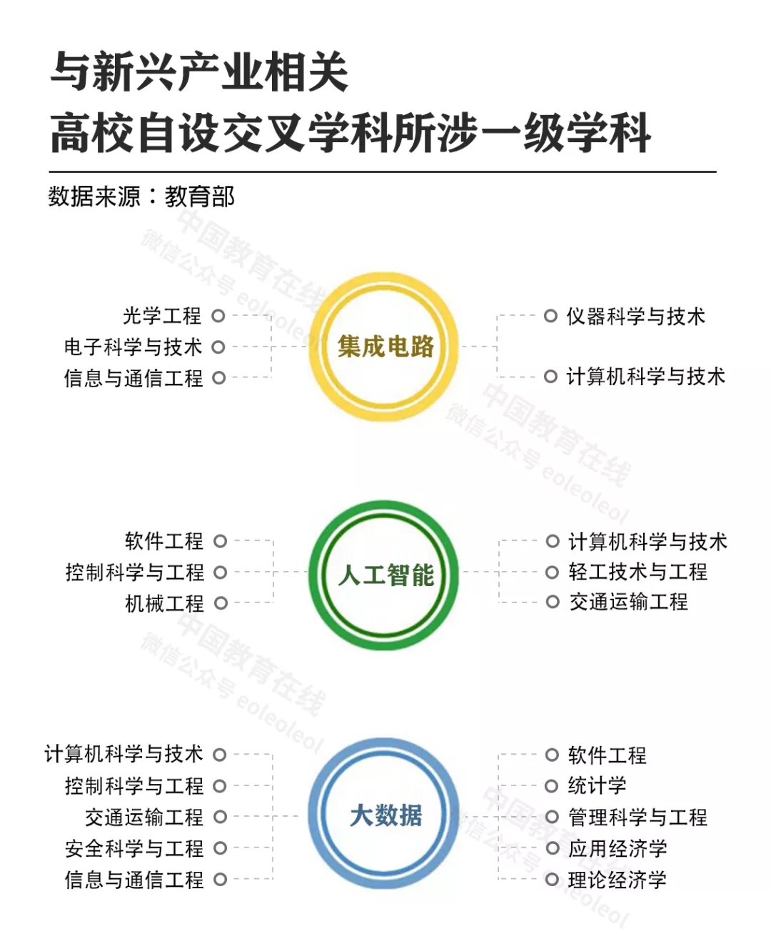 2018年教育部发布的《教育部关于加快建设高水平本科教育全面提高人才培养能力的意见》中提出,要主动布局与战略性新兴产业发展相关的学科专业,如集成电路、人工智能、云计算、大数据、网络空间安全等。