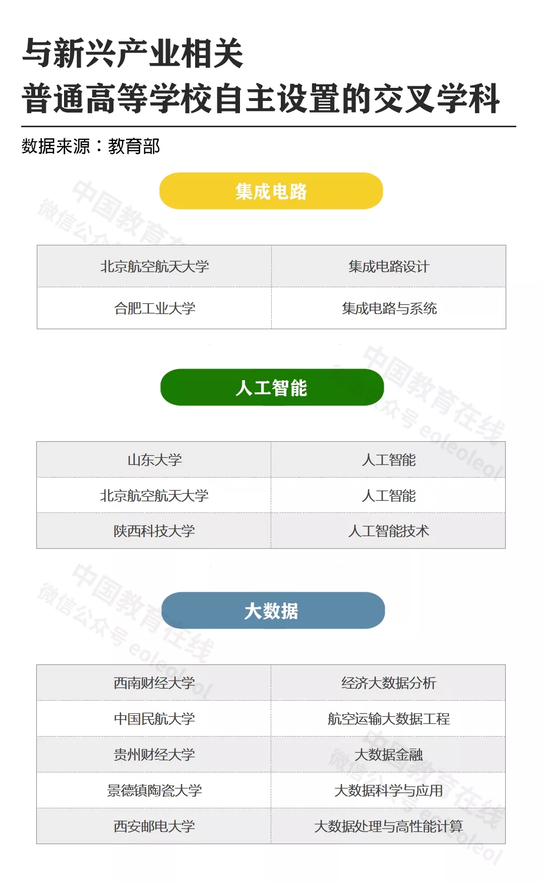 据统计,在上文中提到的教育部于2019年公布的《普通高等学校自设交叉学科名单》中,有14所高校自主设置了与集成电路、人工智能、大数据这些新兴产业相关的10个交叉学科。
