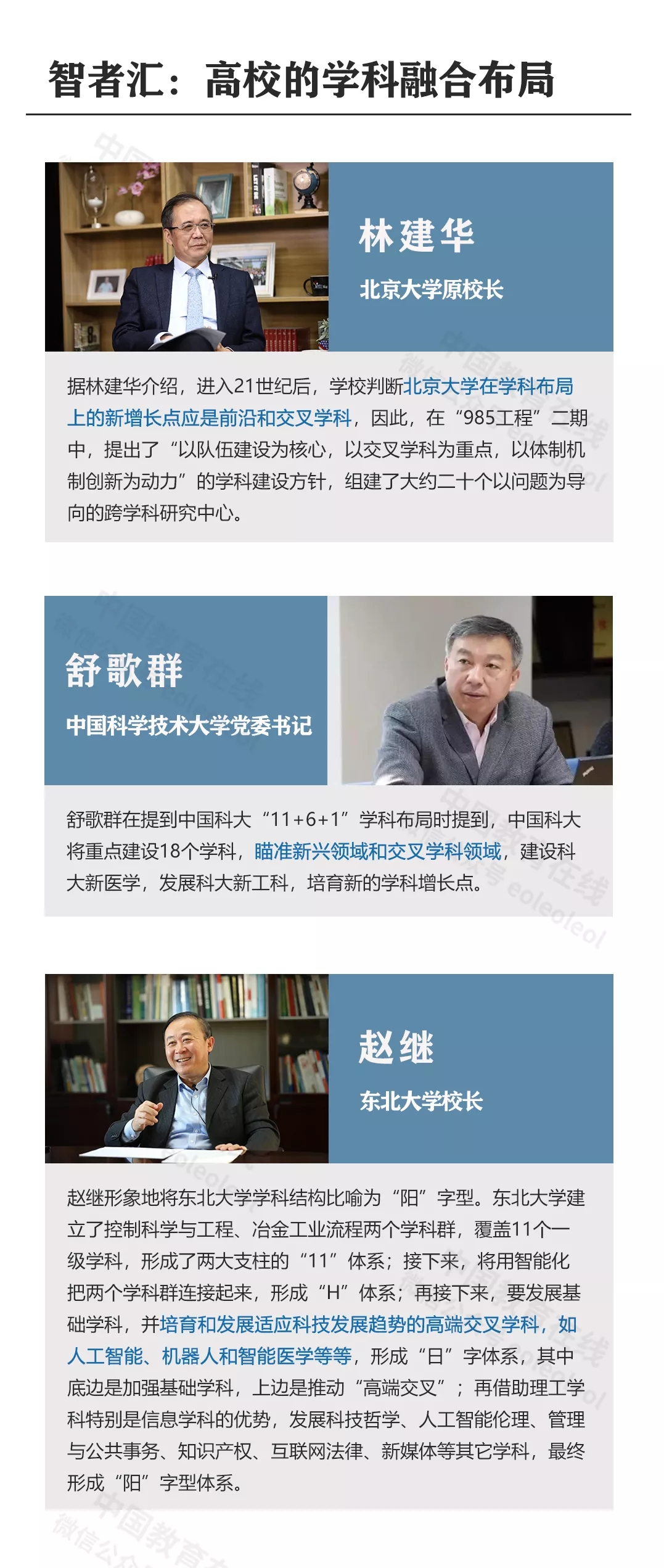 在高校“双一流”建设的大背景下,越来越多的高校已经意识到学科融合是学科建设的新增长点。在中国教育在线总编辑陈志文对高校的系列采访中,北京大学原校长林建华、中国科学技术大学党委书记舒歌群、东北大学校长赵继等都曾谈到了他们在学科建设中对学科交叉融合的重视。