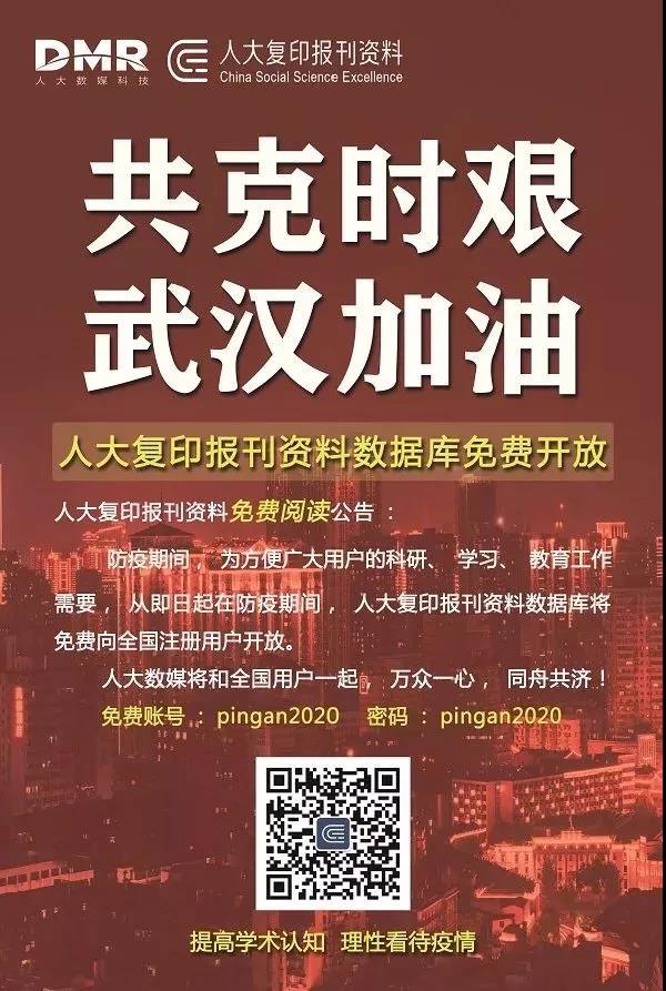 防疫期间,为响应国家号召,方便广大用户的科研、学习、教育工作需要,保证各大高校师生的正常工作、生活不受疫情影响,人大复印报刊资料数据库将免费向全国注册用户开放。账号密码同为pingan2020,登录后使用。