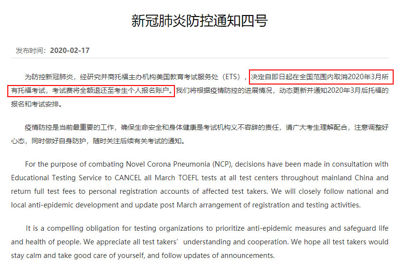 中国大陆地区3月托福、GRE、雅思考试全部取消