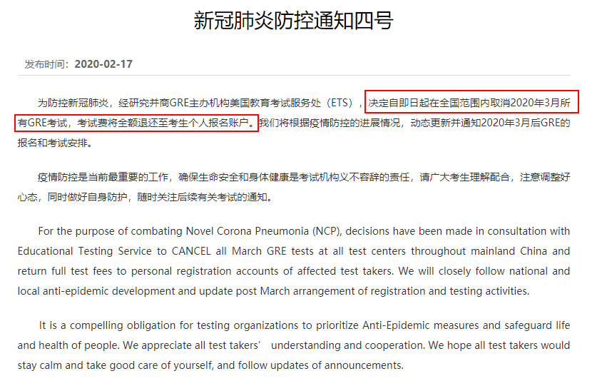 中国大陆地区3月所有GRE考试取消