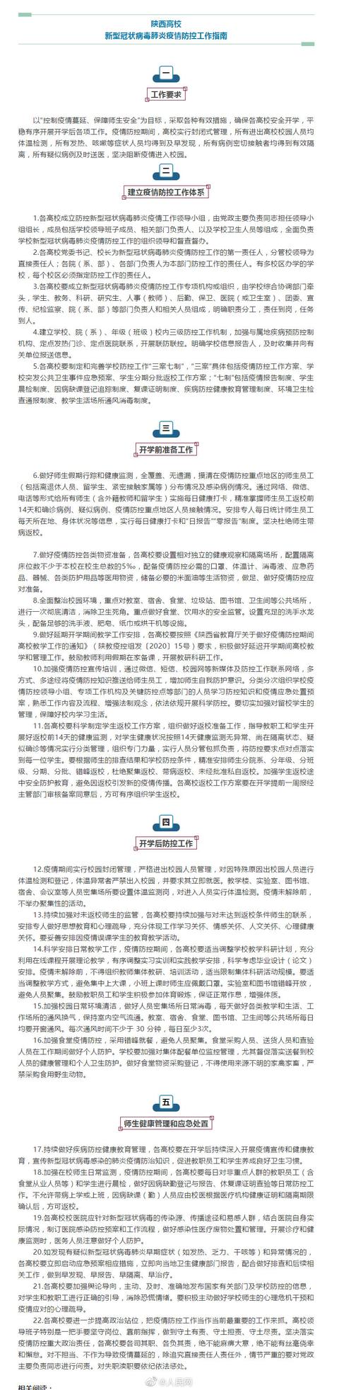 近日,陕西省教育厅出台《陕西高校新型冠状病毒肺炎疫情防控工作指南》,要求疫情防控期间,高校实行封闭式管理,所有进出高校校园人员均进行体温检测,坚决阻断疫情进入校园。精准安排师生分院系、分年级、分班级、分期、分批、错峰返校,杜绝聚集返校、带病返校、未经批准私自返校。