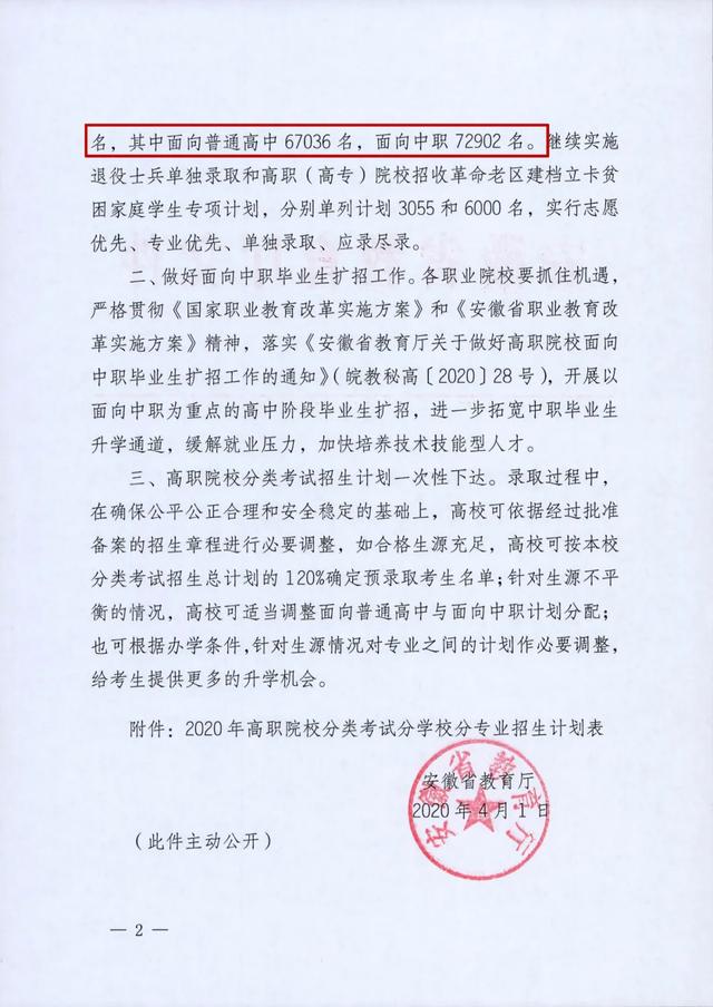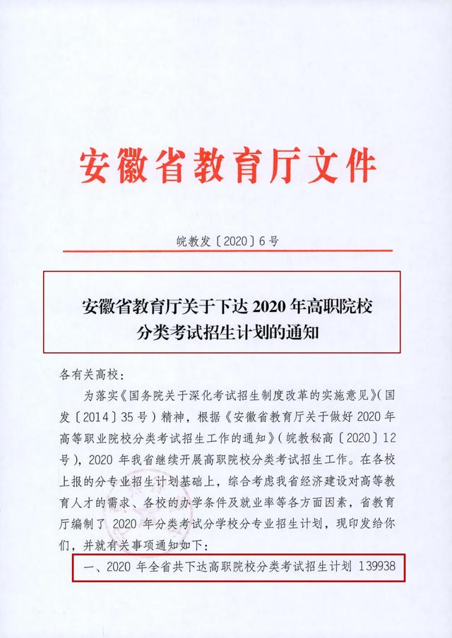 近日,安徽省教育厅关于下达2020年高职院校分类考试招生计划的通知,2020年全省共下达高职院校分类考试招生计划139938名,其中面向普通高中67036名,面向中职72902名。