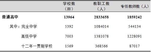 普通高中教职工283.37万人,比上年增加9.11万人,增长3.32%;专任教师185.92万人,比上年增加4.67万人,增长2.57%。生师比12.99:1;专任教师学历合格率98.62%,比上年提高0.21个百分点。