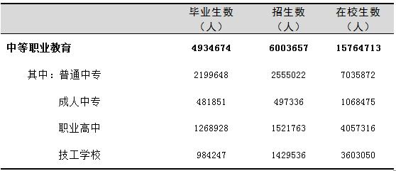 中等职业教育毕业生493.47万人,比上年增加6.19万人。其中,普通中专毕业生219.96万人,比上年增加1.38万人;成人中专毕业生48.19万人,比上年减少2.91万人;职业高中毕业生126.89万人,比上年减少0.40万人;技工学校毕业生98.42万人,比上年增加8.13万人。