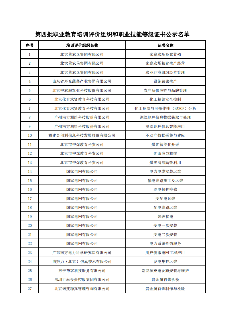 附件:第四批职业教育培训评价组织和职业技能等级证书公示名单