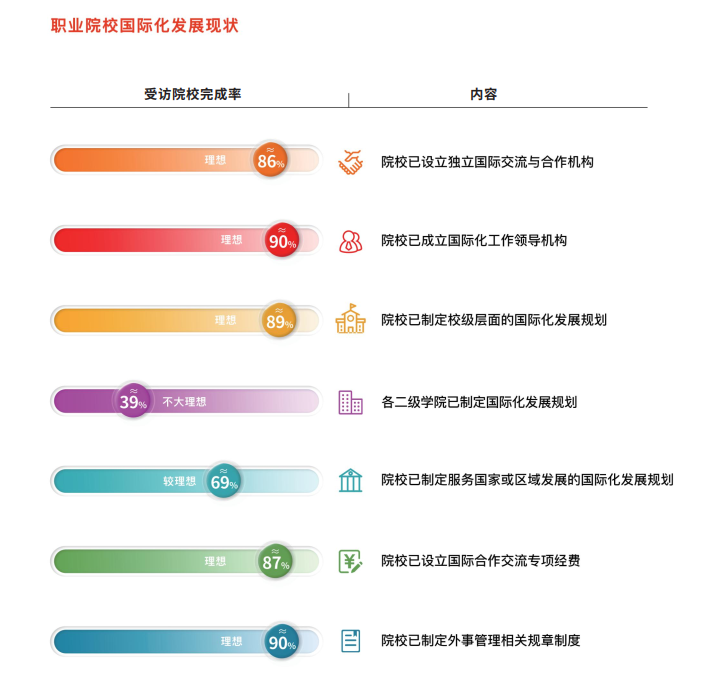 报告指出,职业院校从组织架构和建章立制方面为国际化办学提供保障,超过80%的受访院校已设立独立的国际交流与合作机构、制定校级层面的国际化发展规划、设立国际合作交流专项经费并制定外事管理相关规章制度等。