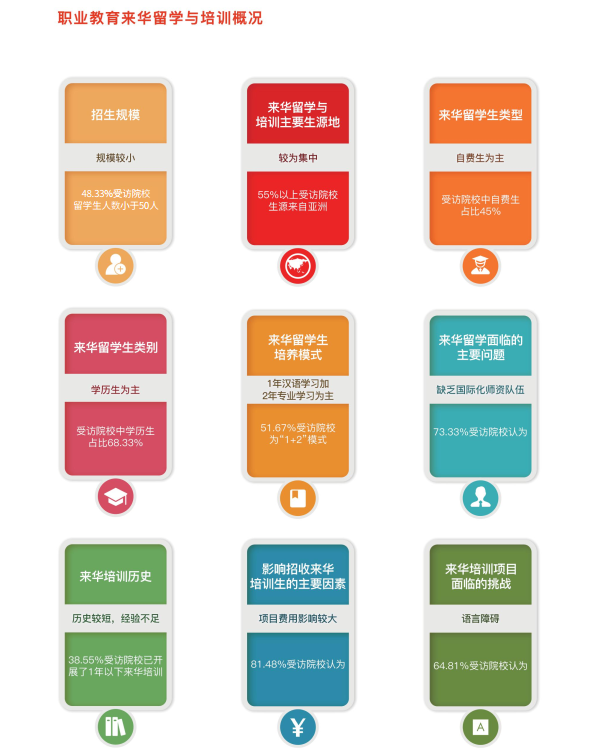 报告认为大多数受访院校的留学生教育稳步推进,实现了从“进修生”到“学历生”的转变;留学生类别进一步扩大,呈现出向更高层次、更宽领域、更主动的方向发展态势;留学生管理体系进一步完善,受访院校积极探索多种留学生人才培养模式。大部分受访院校来华培训处于起步阶段,主要生源地为亚洲,费用问题是影响来华培训的主要因素。