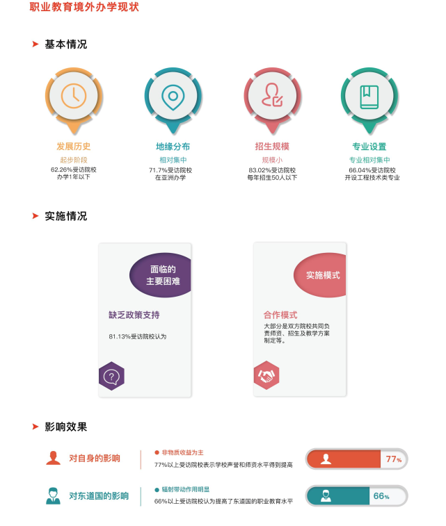 针对职业院校境外办学现状,报告指出,大部分受访院校境外办学尚处于起步阶段,办学历史短、办学规模小、地缘分布和专业设置相对集中;办学模式主要为合作模式,双方共同负责师资派遣、招生和制定教学方案等。境外办学效果以非物质收益为主,经济收益较少;对东道国的辐射带动作用明显,有助于东道国提升职业教育水平、更新教育理念与方法。