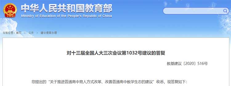 答复中表示,下一步,教育部将进一步促进基础教育内涵发展,将加强和改进教学工作摆在更加重要的突出位置,积极完善相关政策措施,严格规范教学管理,推进深化普通高中育人方式改革,大力发展素质教育,促进学生健康成长。